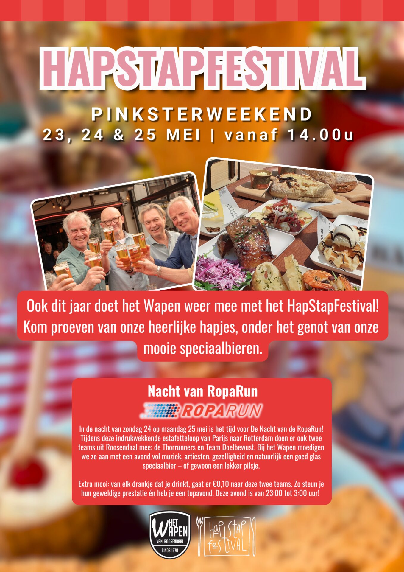 Kom jij op 23, 24 en 25 mei naar HapStap tijdens het pinksterweekend? Het Wapen doet ook weer mee. Kom proeven van onze heerlijke hapjes, onder het ge...